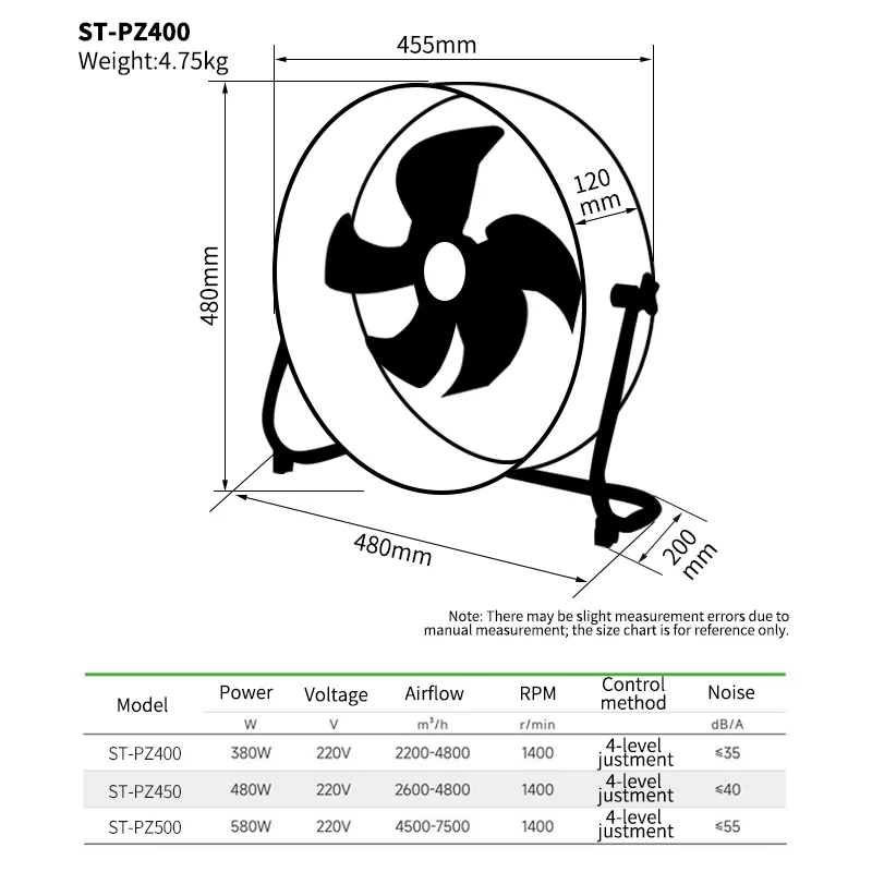 | ST-PZ400 (16 inch) | 380W | 220V | 2200-4800m³/h | 1400r/min | 4-speed | ≤35dB/A | 4.75kg | 400mm |